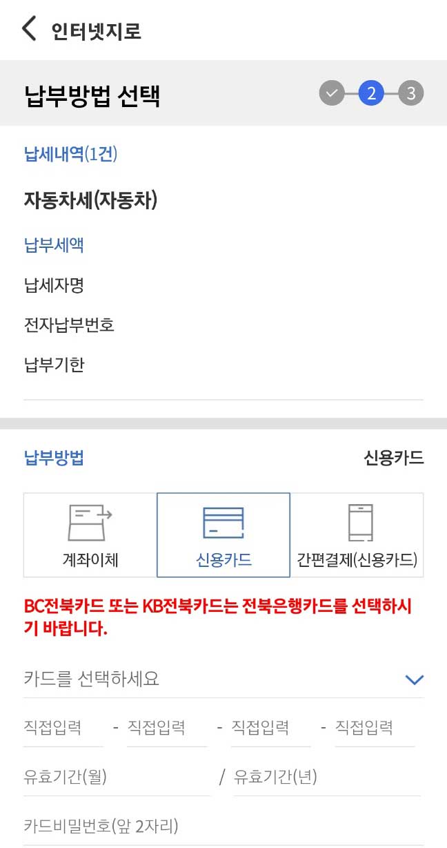 카드납부 선택시 카드선택 후, 입력란에 알맞게 입력하시고 납부하시면 자동차세 타인납부 카드로 납부하기가 완료가 됩니다.