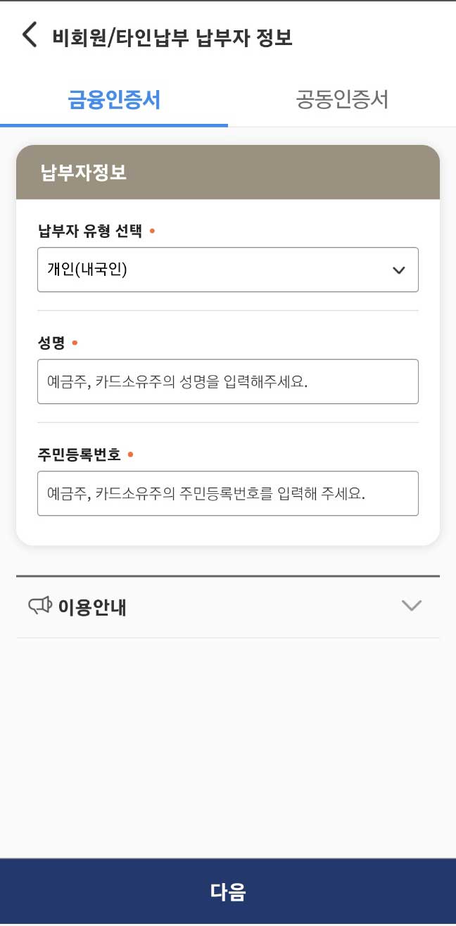 타인납부, 회원납부 중 원하시는 납부방법을 선택하세요.