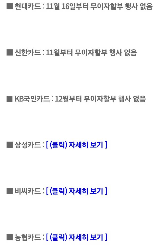 삼성, 하나, 농협, 비씨카드 등은 대부분 2 ~ 3개월 무이자행사를 진행했습니다.